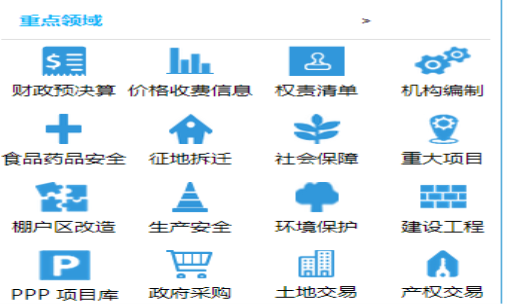 公开内容包括机构设置和职能、政府文件、政府工作报告、政府重要会议、各类规划、政府重大督办事项、突发公共事件应急预案及处置情况、行政审批、财政预算决算和“三公经费”、社会保障、食品药品安全、环境保护信息等。