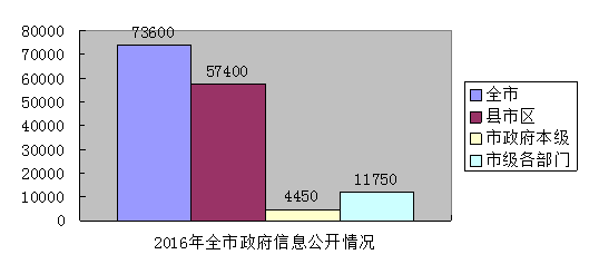 2016年,酒泉市各级各部门主动公开发布各类政府信息73600多条,其中:7个县(市、区)主动公开各类政府信息57400多条,酒泉市政府本级主动公开信息4450多条,市政府各部门主动公开各类信息11750多条。