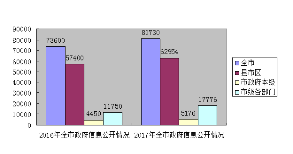 1.主动公开政府信息数:80730条,比2016年增加7130条。从公开数量上看,公开的信息总数有所增长,尤其是行业监管、政府债务,环境违法处罚等以往没有公开的信息得到公开。