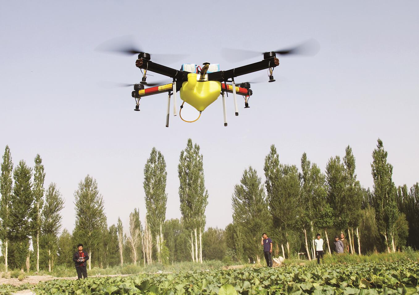 瓜州县瓜州镇西域风瓜果产销农民专业合作社用植保无人机喷洒农药。 据介绍,植保无人机喷施一亩地只需一分钟,一天可作业4个小时,喷施面积200多亩,效率高、速度快,可以减少农药和水的用量,降低人力、物力等成本,提高防治效果,减轻农药对环境的污染及作业人员的二次伤害。